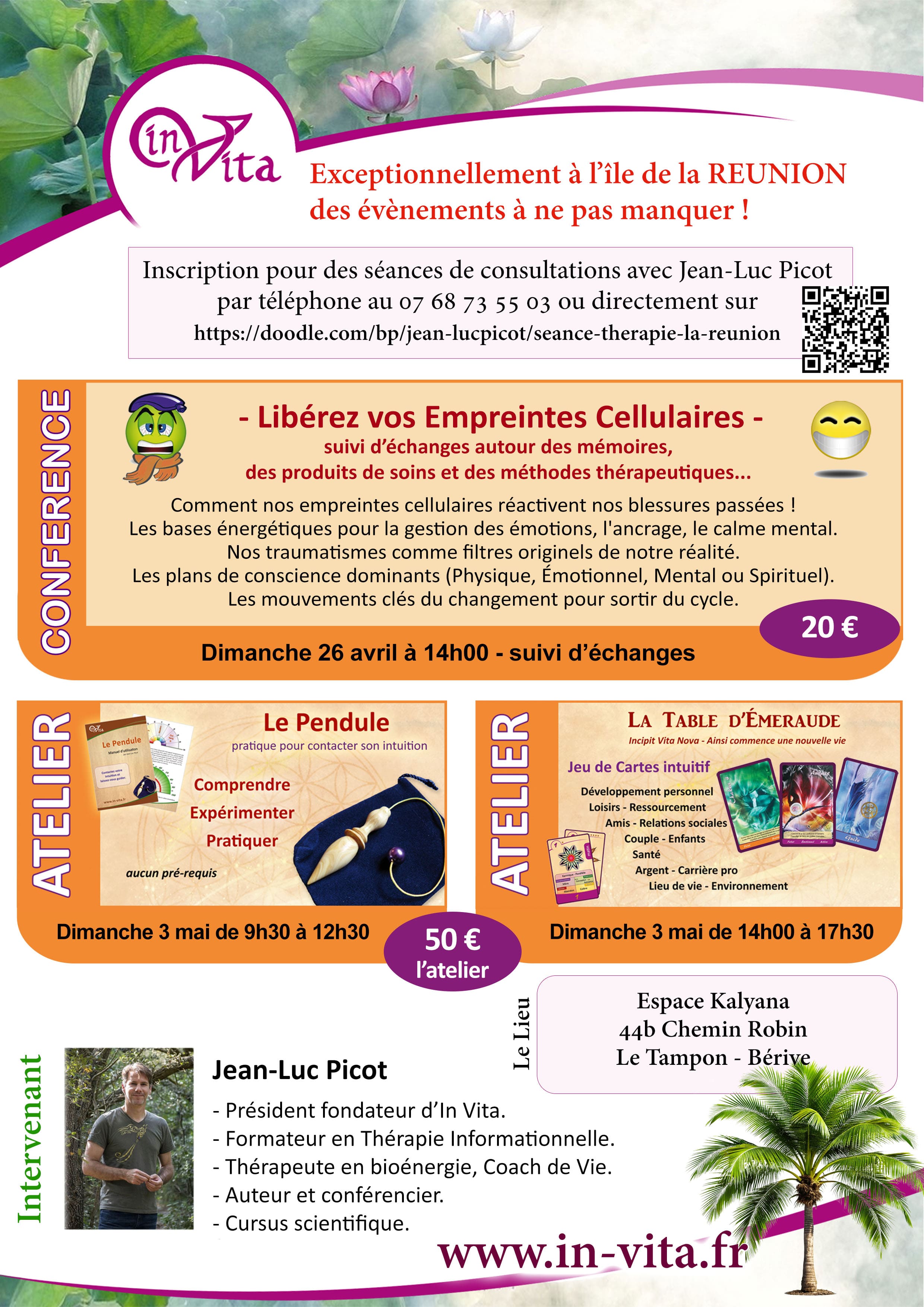 Jean-Luc Picot sera exceptionnellement disponible en séance thérapeutique à l'île de la RÉUNION du 29 avril au 2 mai. Pensez à réserver votre séance de consultation : Réserver une séance.